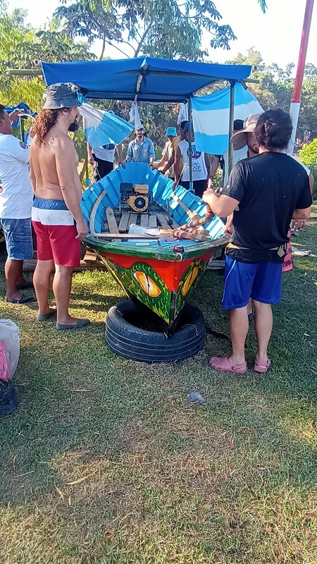 Los “50 kilómetros, 6 horas de viaje por río y más de 40º de temperaturas que se sienten fuerte”, comentó uno de los tripulantes a ERA Verde. A las 11:30 llegaron a Puerto Vilelas, donde fueron recibidos en el camping municipal por la Asociación de Pescadores del Chaco, representados por Cachito, amigo de muchos años de Luis Cosita Romero, quien navega junto a Nelson Yapura, Francisco Paredes, Mariano Martínez y Martha Arriola. Los esperaron con una rica merienda con productos artesanales, mucha agua fresca y se compartió charla sobre trabajo del pescador artesanal y el arte que lo rodea, como el de tejer redes. También se sumó a la charla y a la compartida el grupo de prefectos que viene acompañando y cuidando a los remeros.