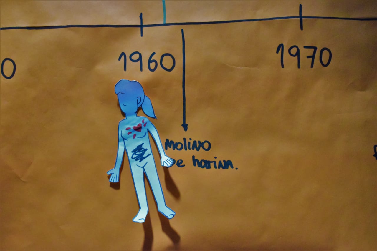 El mapeo del territorio como cuerpo y plasmado en una gigantografía sistematiza la información relevada por médicos y medicas del Insaa, en donde se denuncia el impacto en nuestros cuerpos y en la salud de las comunidades de “incendios, inundaciones, mega minería, pueblos fumigados, ríos cercados y envenenados, empresas que avanzan y destruyen nuestros territorios, (y) una justicia ciega”.