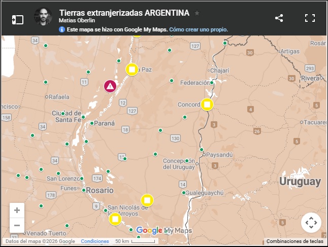 Los departamentos Gualeguay y La Paz poseen el 9% de su superficie en manos de extranjeros. Son los dos distritos con mayor porcentual sobre su territorio total en un guarismo que duplica el promedio nacional, según el cruce de datos realizados por ERA Verde en base a los publicados por el Observatorio de Tierras. Este instituto fue creado por iniciativa de docentes e investigadores de la UBA, quienes pusieron a disposición el registro de su investigación en un mapa interactivo. “Vemos con preocupación el problema de la concentración de tierras y su extranjerización en nuestro territorio”, señalan en la presentación del trabajo. Los científicos señalan un patrón común claro: “las situaciones más críticas se dan en zonas fronterizas —tanto en el norte como en la cordillera— y en territorios con recursos hídricos, mineros o ventajas logísticas como puertos”.