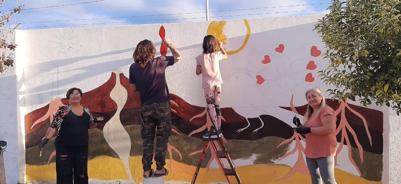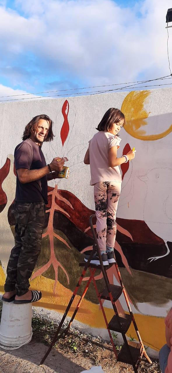 El trabajo muralista lo llevó adelante Miriam Brunetti y su hija Reggina Zumino, junto a Cristian Etulain, Norma Hergenrether, Zulma Castaño y Luisina Viviani. Ramón Velázquez, promotor y alma mater de esta iniciativa, agradeció a Pinturerías Calcagno por donar los materiales, al Club Sociedad Sportiva por ceder la pared para la obra plástica y a “a los vecinos que nos brindaron energía eléctrica”, enumeró el promotor socio ambiental.