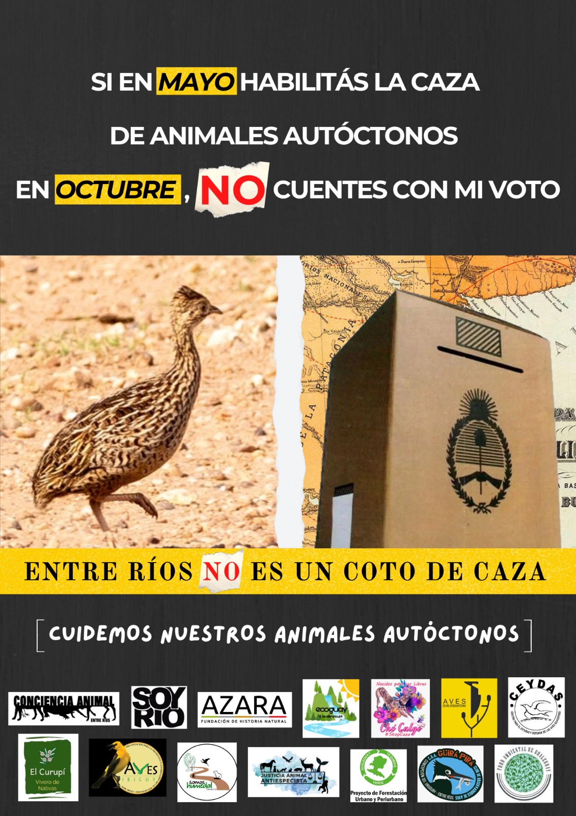 Ante la posibilidad que en el mes de mayo se habiliten algunas modalidades de abatimiento de especies nativas en cotos, una decena de organizaciones no gubernamentales lanzó una campaña de alerta. Y en este sentido manifestaron que no acompañarán con el sufragio en caso que esto efectivamente se concrete. “Las ONG de Entre Ríos –hoy acompañadas por instituciones de prestigio nacional como Fundación Azara y Che Galgo– volvemos a decir no a la caza de animales autóctonos. Y lo decimos hoy en el Día del Animal”, señalaron a través de redes sociales en una comunicación que suscriben además de las entidades mencionadas “Conciencia Animal”, “Soy Río”, “Ecoguay”, “Aves Gualeguaychú”, “Ceydas”, «Somos Humedal», “El Curupí Vivero de Nativas”, “Aves Ibicuy”, “Justicia Animal Antiespecista”, “Gualeguay te Quiero Verde”, COA “Güirá Pirá” y “Foro Ambiental de Gualeguay”.
