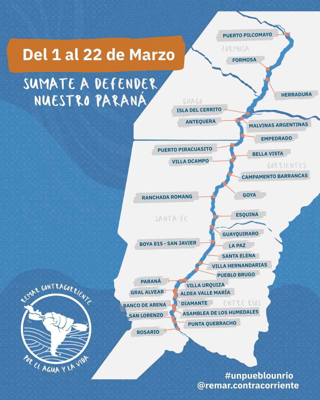 La travesía náutica se llevará a cabo entre el 1 y 22 de marzo. Saldrá en Puerto Pilcomayo, donde el río Paraná y el Paraguay se unen, dando inicio a una travesía que va a recorrer más de 20 puntos, y pasará por ciudades como Resistencia, Corrientes, Goya, Santa Fe y Paraná para generar espacios de encuentro, asambleas, charlas y actividades culturales en cada parada, comentó desde la organización. Se tiene programado culminar en Rosario, el 22 de marzo, Día Internacional del Agua, donde se espera la llegada de varias embarcaciones y celebración por parte de las entidades participantes.