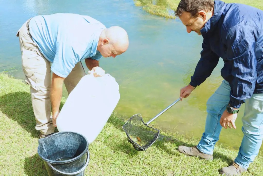 Sobre las características de los cuerpos de agua para poder ser sembrados, dijo el investigador, es que “sean artificiales, o sea creados por el ser humano” y “que no tengan contacto con ningún cuerpo de agua natural”. Además, “se debe garantizar eh la provisión de agua en forma permanente, que no se sequen, y contar con las características de calidad de agua para garantizar la vida de los peces, que esos son este análisis que nosotros hacemos in situ y en laboratorio, previa comunicación”.