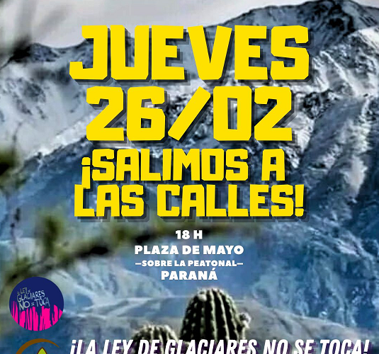 “Sin glaciares no hay agua, sin agua no hay vida”, afirma la consigna a salir “a las calles” en una movilización que se replicará en distintas localidades de la República Argentina en rechazo a la reformo de la Ley de Glaciares, que protege este tipo de formaciones en el territorio. En Paraná la marcha parte este jueves 26 de febrero de Plaza 1º de Mayo, a la hora 18:00. Se recorrerá la Peatonal San Martín bajo las consignas “Ley Glaciares no toca”; y también “¡No a la baja de edad de punibilidad! INo a la reforma laboral!”, propuestas que también se abordarán en el Congreso ese día.